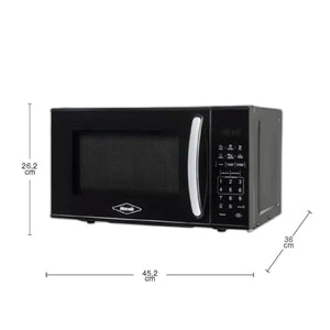 Este horno microondas Haceb es una excelente opción para cocinas modernas, con diseño elegante en color negro y detalles plateados. Ideal para espacios pequeños y familias reducidas.