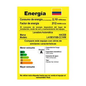 Con la Lavadora HACEB Ivy 19 Kg Carga Superior Negra - LAV IVY 19 KG D NE optimiza el tiempo de lavado y alarga la vida de tus prendas. Cuenta con un tablero digital con tecnología que te ofrece programas y funciones especiales que se adecúan a cada tipo de prenda. Además, incluye 5 programas automáticos y tecnología de lavado profundo. Posee filtración activa para reducir pelusas en tu ropa, sistema ECO para ahorrar agua y Aero centrifugado para prendas más secas.