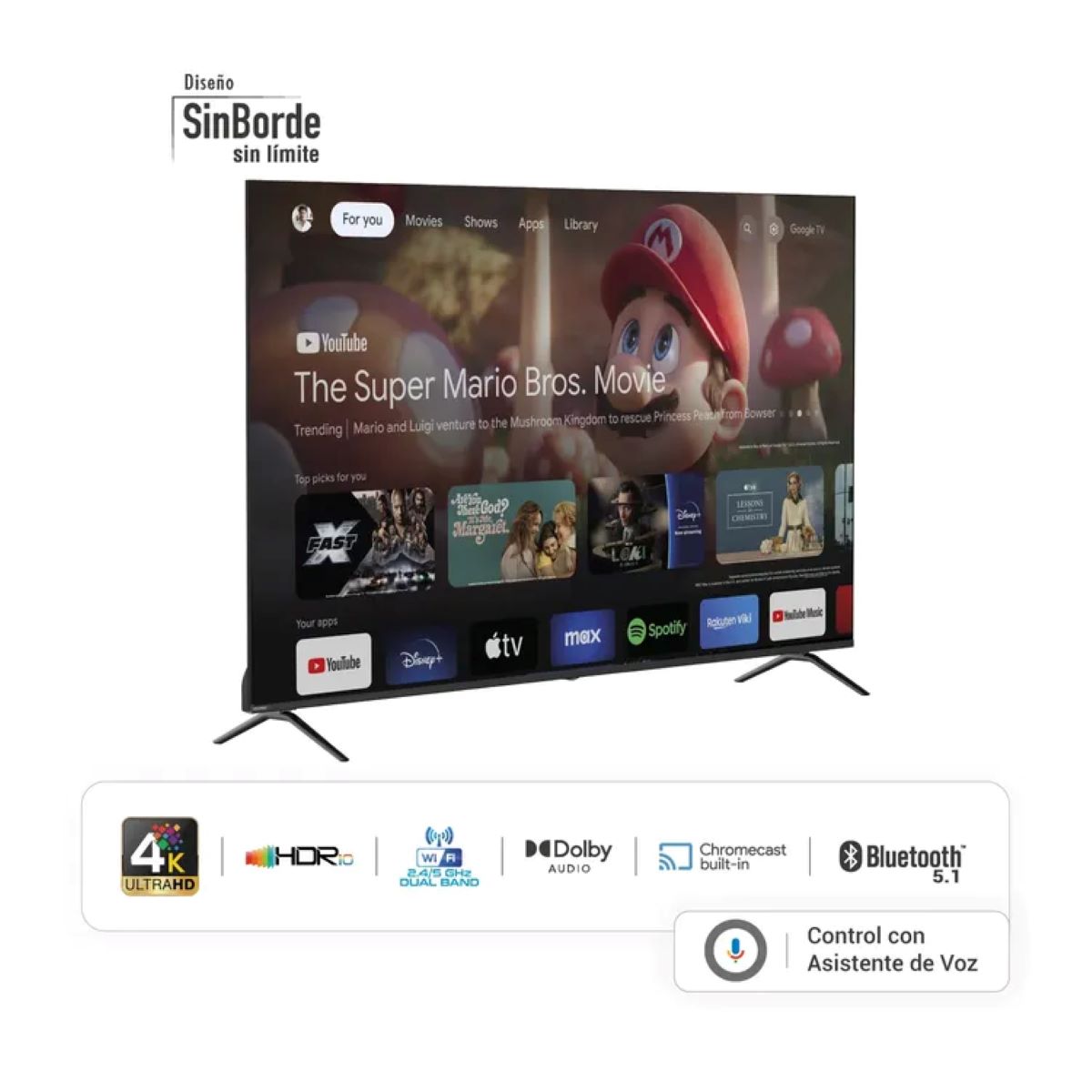 Con Google TV integrado, accede a tus aplicaciones favoritas como YouTube, Netflix, Disney+ y más, todo en una interfaz intuitiva. Además, cuenta con Google Assistant y Chromecast para controlar tu TV por voz y compartir contenido desde tu smartphone fácilmente.