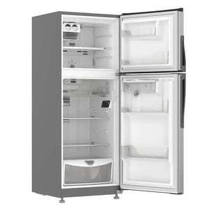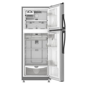 Refrigerador Top Mount de 262 litros con dispensador de agua exterior, superficie anti-huellas y sistema de deshielo automático. Cuenta con tecnología 3D de distribución de aire, manteniendo la frescura de los alimentos por más tiempo. Además, tiene un cajón para frutas y verduras, compartimiento extra frío, cajón con control de humedad, anaquel con capacidad para latas y botellas, tanque de agua de 2 litros y luz LED.