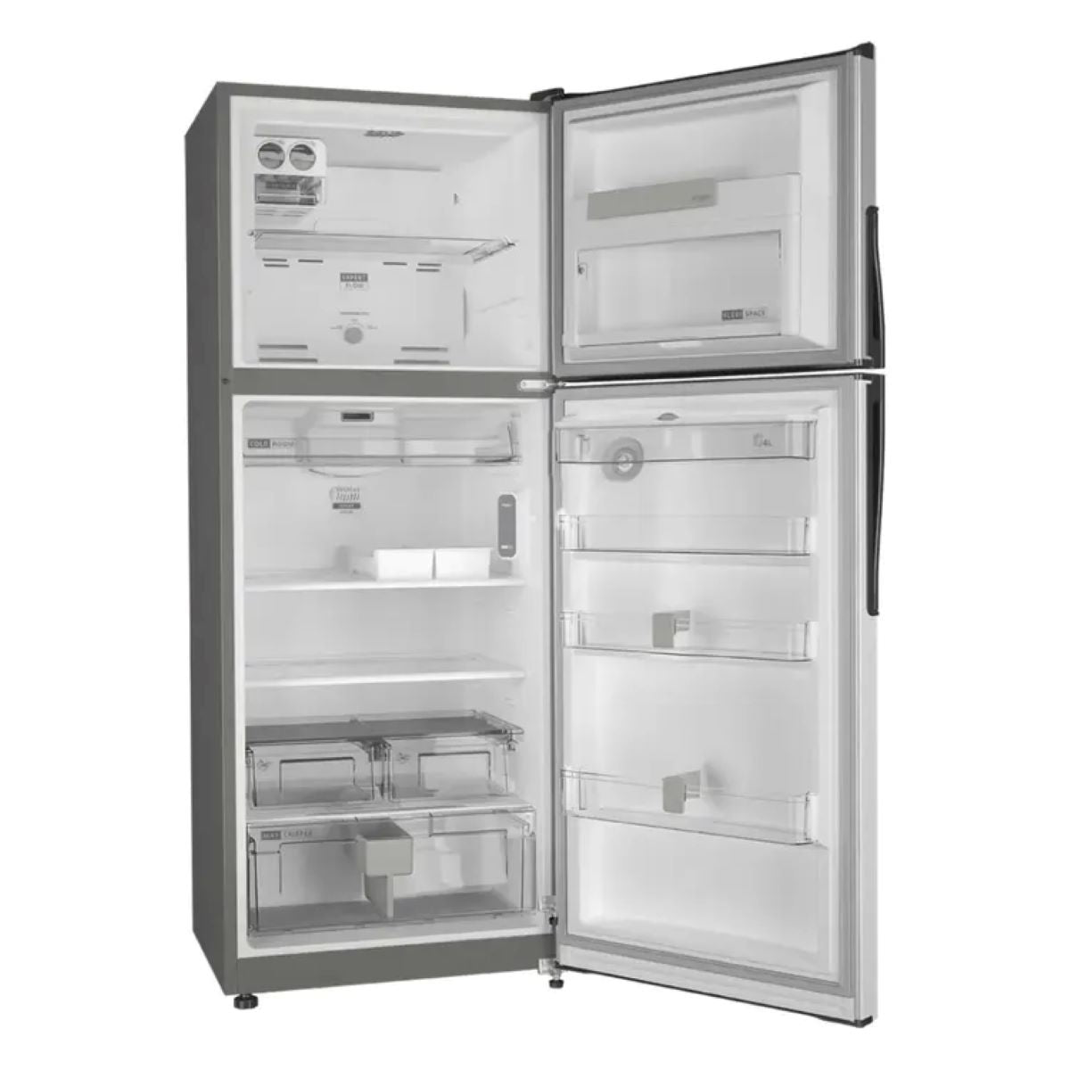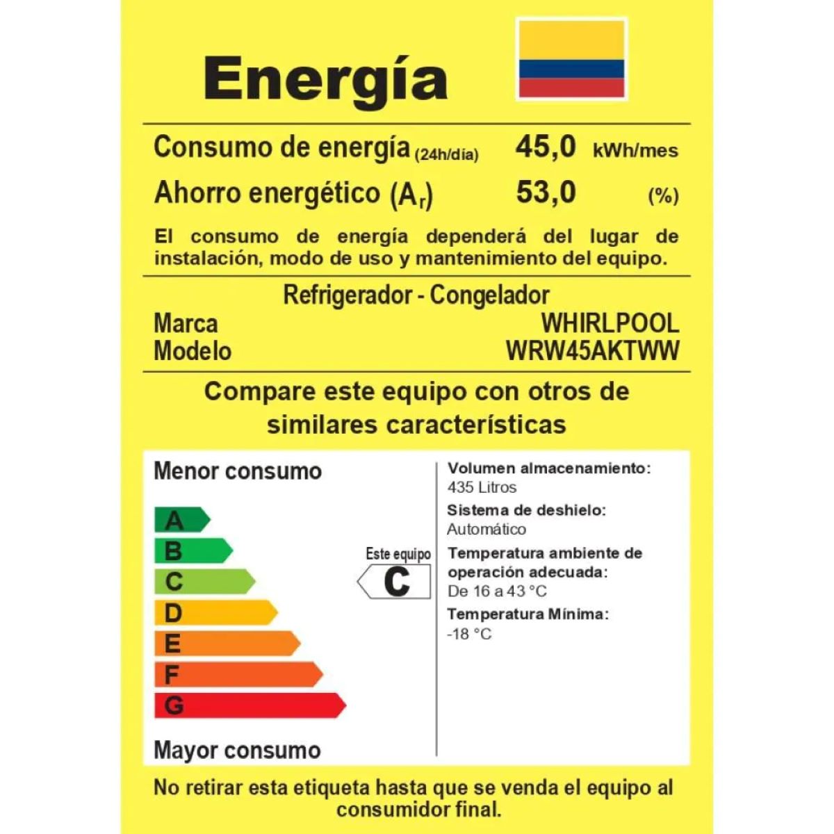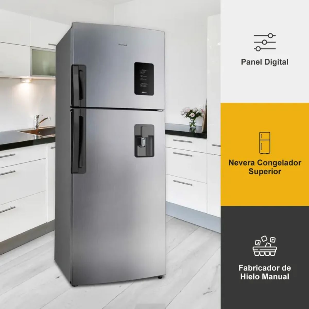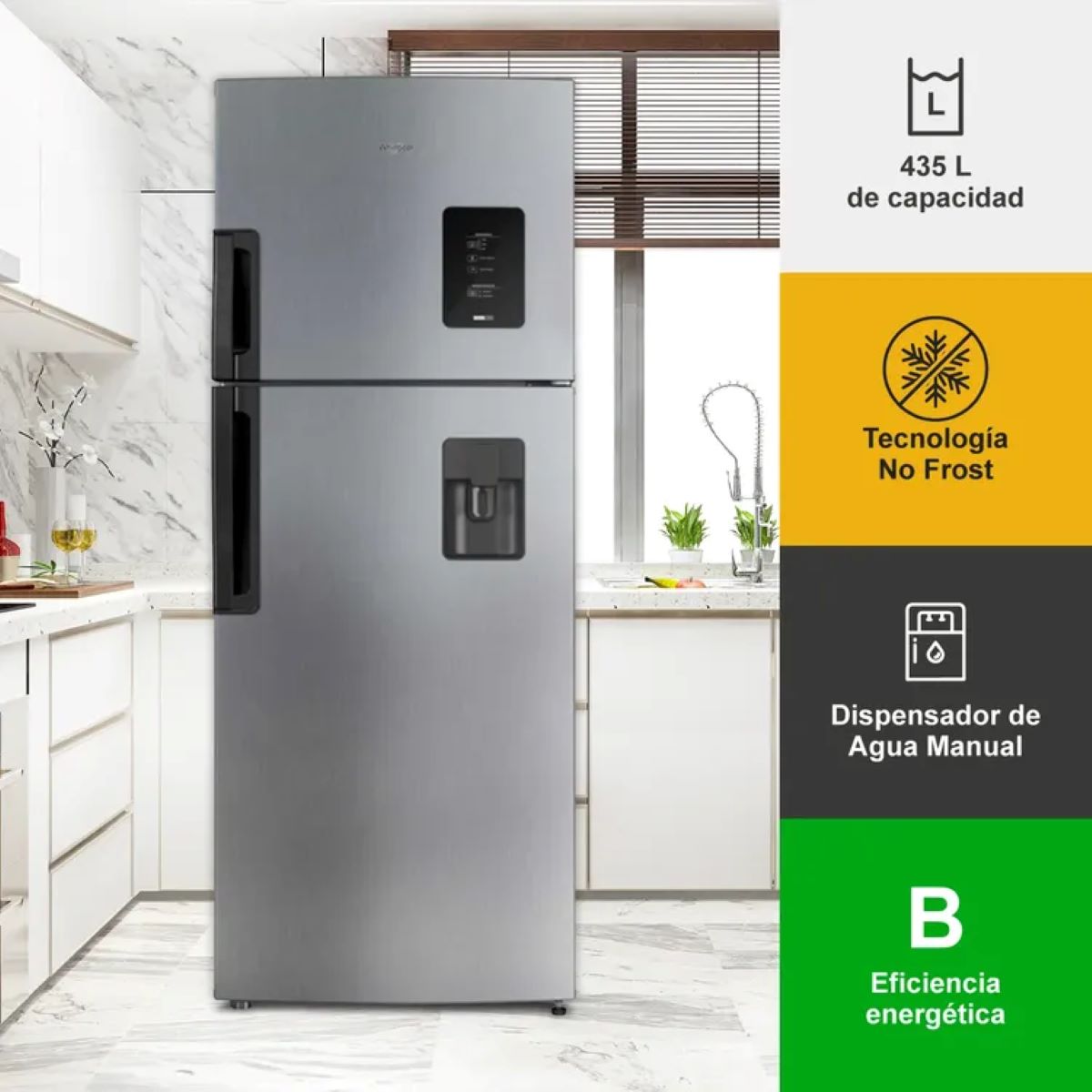 Nevera WHIRLPOOL No Frost Congelador Superior 435 Litros WRW45AKTWW Gris, con superficie Anti Fingerprint, panel digital y control electrónico de temperatura. Cuenta con tecnología Xpert Flow que mantiene la temperatura ideal y homogénea en todo el refrigerador para una mejor conservación de los alimentos, dispensador de agua exterior con capacidad de 4Lts e iluminación LED para mayor visibilidad al interior. Tiene un compartimiento Cold Room, parrillas ajustables de cristal templado, cajones de frutas y verduras.