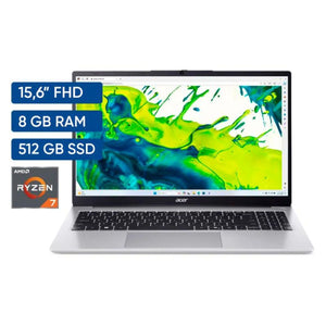 Portátil Acer Aspire AL15-43PR1E con pantalla 15.6” Full HD, procesador AMD Ryzen™ 7, 8 GB RAM, 512 GB SSD, gráficos Radeon™, y Windows 11.Diseño elegante en color plateado, ideal para productividad, estudio y entretenimiento.