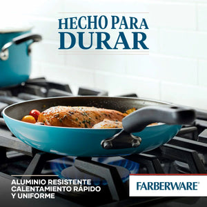 Conjunto de 2 sartenes FARBERWARE en elegante color aguamarina con revestimiento Diamond. Diseñadas para distribuir el calor de manera uniforme, estas sartenes ofrecen durabilidad y excelente desempeño en la cocina. El revestimiento antiadherente facilita la cocción y limpieza, mientras que su construcción resistente garantiza años de uso. Ideales para preparar desde desayunos hasta comidas completas con resultados profesionales en tu hogar.