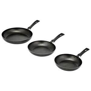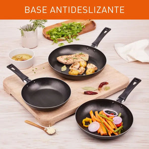 Set de 3 sartenes IMUSA en aluminio de alta pureza con recubrimiento antiadherente Basic, en tamaños de 18 cm, 20 cm y 24 cm, ideales para cocinar con menos grasa, evitar que los alimentos se peguen y lograr una cocción uniforme