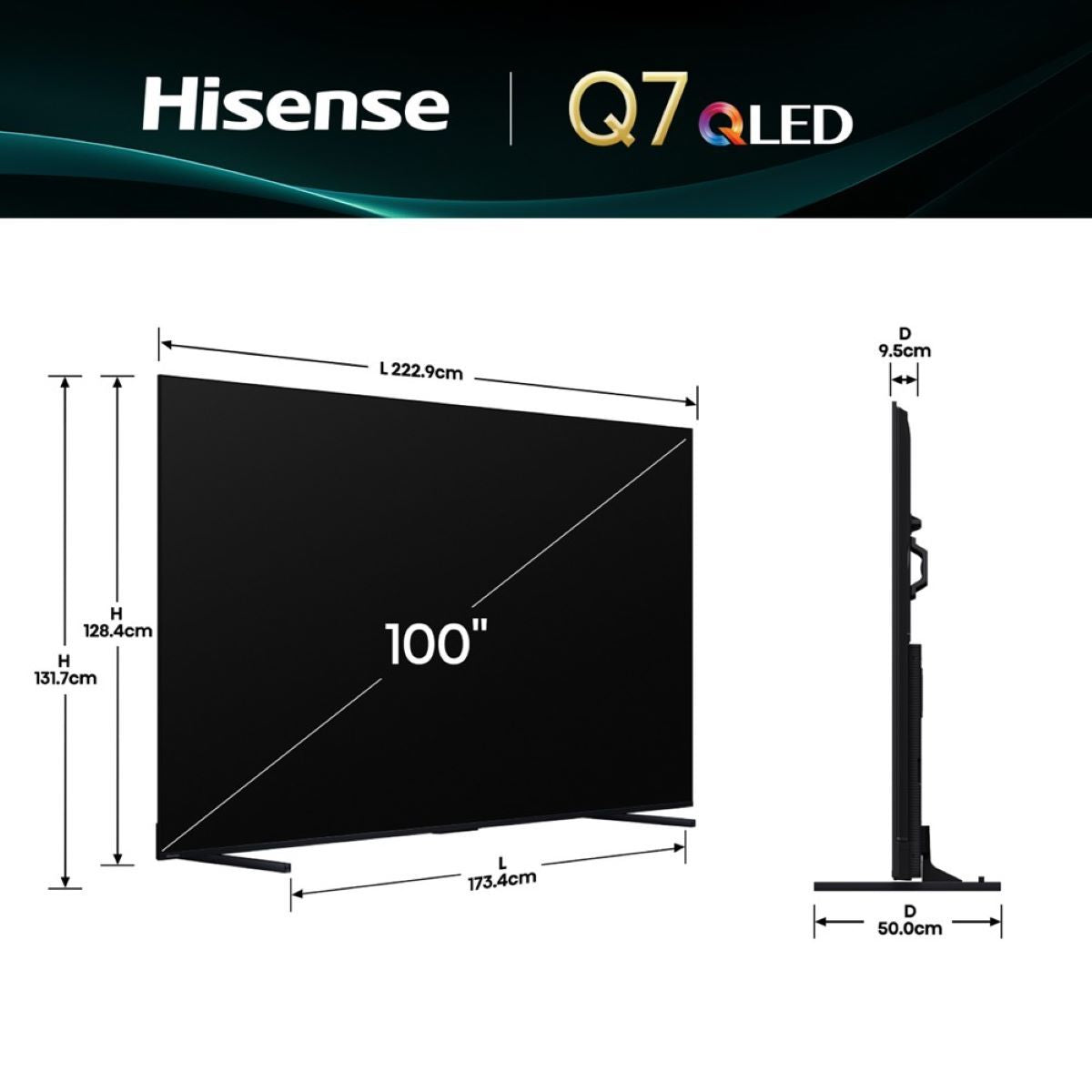 El Televisor Hisense 100" Q7QG con resolución UHD 4K, tecnología Quantum Dot para colores más vivos, Dolby Vision y Dolby Atmos para una experiencia cinematográfica, sistema Google TV con control por voz y acceso a miles de aplicaciones. Ideal para disfrutar contenido en gran formato con calidad premium.