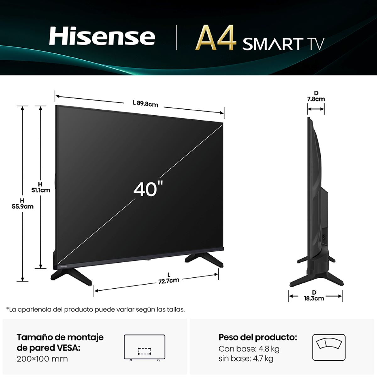 El Hisense 40A4NV es un televisor LED de 40 pulgadas con resolución Full HD, sistema operativo VIDAA U9, sonido envolvente DTS Virtual:X y conectividad inteligente con Wi-Fi y Bluetooth. Ideal para entretenimiento en casa con excelente calidad de imagen y funciones Smart.