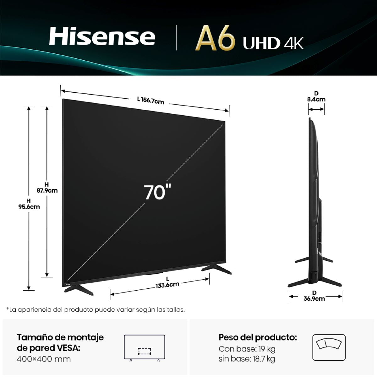 El Hisense 70A6NV es un televisor LED de 70 pulgadas con resolución 4K UHD, sistema operativo VIDAA, Dolby Vision, control por voz y funciones avanzadas para gaming. Ideal para disfrutar de una experiencia visual inmersiva en gran formato.