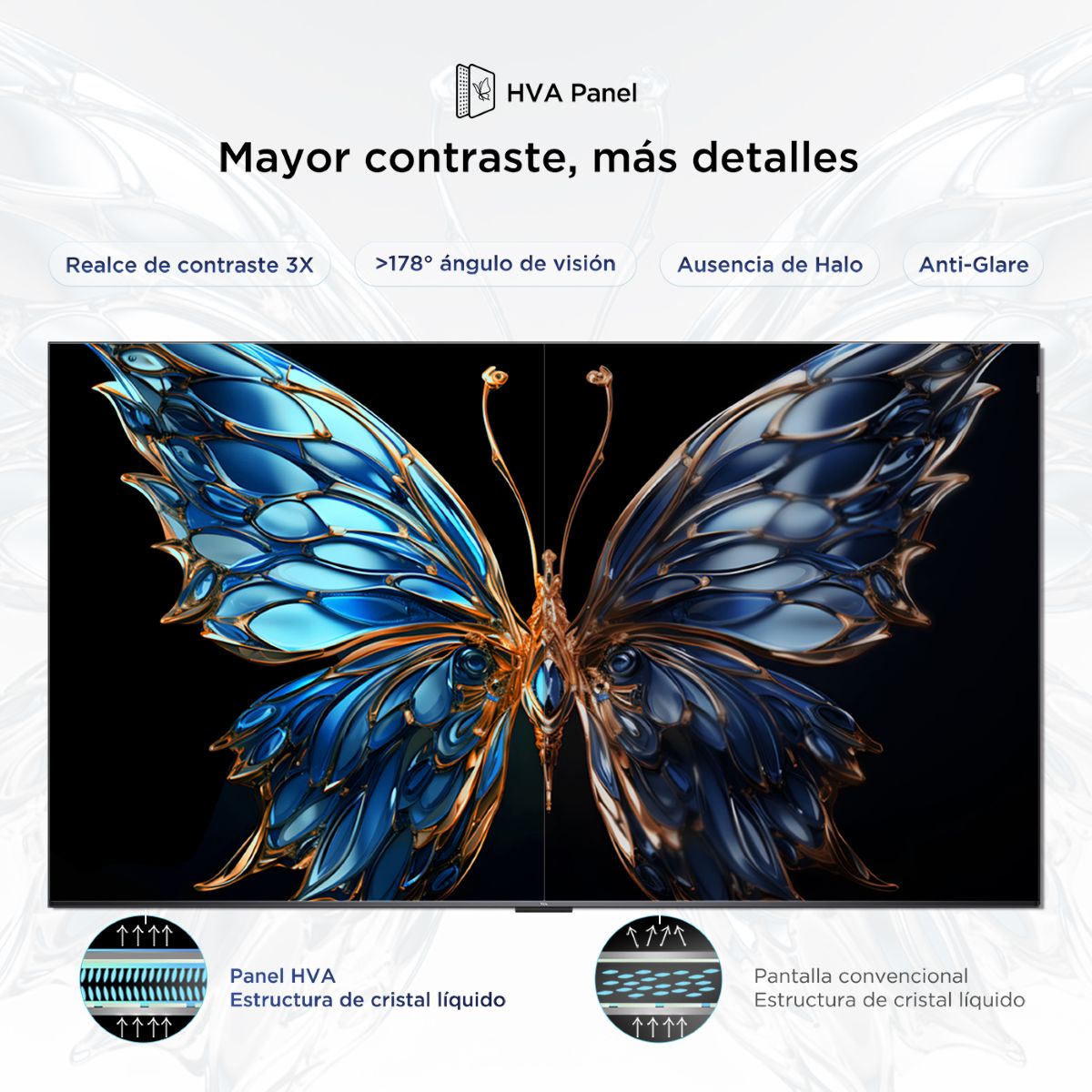 Gracias a su compatibilidad con HDR10, HLG y Dolby Vision, el televisor ajusta dinámicamente el brillo y el contraste para mostrar detalles tanto en escenas oscuras como en áreas brillantes, logrando una experiencia visual cercana a la intención original del creador del contenido. El panel HVA desarrollado por TCL mejora el contraste y reduce la interferencia de la luz ambiente, proporcionando una imagen más clara y uniforme desde diferentes ángulos.